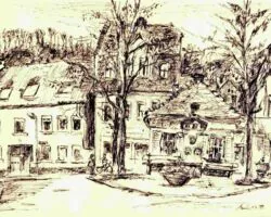 Blick von der Volksschule (heute Wilhelm-Spies-Haus) in die Möhnstraße um 1950, dort später Weinrestaurant Schmitt Bildgeber: Joachim und Michael Horber
