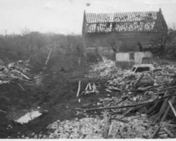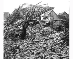 Bombentrichter vom 20.12.1943 im Leitgraben an der Ecke Riedweg/Am Leitgraben zwischen "Bobbestub" (beschädigt) und Haus Urban (sehr schwer beschädigt). Bildgeber Josef Möhn