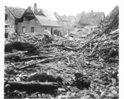 Vordere Talstraße 1945 nach Bombenangriff vom 1.2.1945; Häuser zwischen Im Brühl und Vordere Talstraße; hinten auf dem Foto die Mittlere Talstraße. Bildgeberin Adelheit Straus