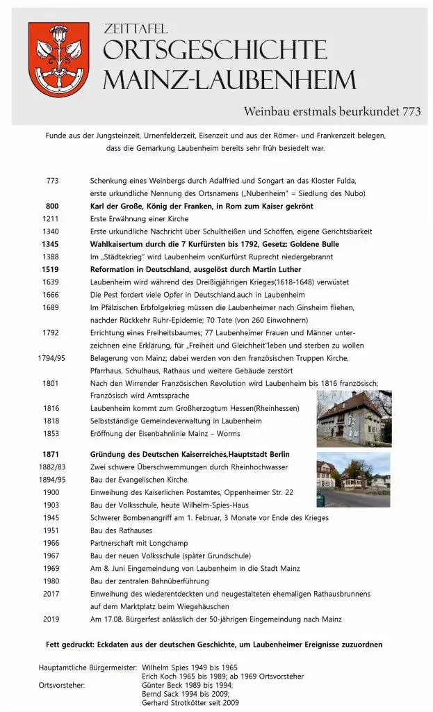 (Quelle: Dr. Gebhard Kurz, Ortshistoriker; aktualisierte Version in Die Straßen von Mainz-Laubenheim – Schriftenreihe zur Ortsgeschichte von Mainz-Laubenheim, Heft 4, April 2017, Wolfgang Stampp)