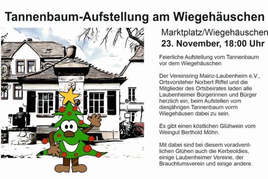 Der Heimat- und Verkehrsverein Laubenheim/Rhein e.V. lädt herzlich zu dem Vortrag „Mundarten in Rheinhessen“ mit Dr. Rudolf Post ein. Das Gebiet zwischen Worms, Mainz und Bingen, das seit mehr als 200 Jahren Rheinhessen genannt wird, war und ist vielen verschiedenen sprachlichen und kulturellen Einflüssen ausgsetzt, was sich in den verschiedenen Dialekten niederschlägt. Dr. Rudolf Post hat die Entwicklung und Herkunft in seinem spannenden Vortrag und gleichnamigen Buch „Mundarten in Rheinhessen“ erforscht und zusammengefasst. Kosten: gegen Spende Anmeldung: Heimat- und Verkehsverein Laubenheim/Rhein e.V. Website: https://hvv-laubenheim.de Foto: Dr. Rudolf Post Mainz, 12.11.2025 – Unter dem Motto „Vater Rhein erzählt“ laden Werner’s Backstube und die Mobile Bücherei Mainz am Samstag, 22. November 2025, zu einer atmosphärischen und generationenübergreifenden Märchen- und Sagenstunde ein. Die Veranstaltung ist Teil der SWR-Aktion „Nacht gegen die Einsamkeit“. Im Rahmen der interaktiven Vorlese-Stunde begeben sich große und kleine Gäste auf eine literarische Zeitreise in die Welt der Ritter, Burgfräuleins, Nixen und sagenhaften Gestalten des Rheintals. Ob die Herkunft des Mainzer Rades, das Geheimnis des Lumpenglöckchens oder die Namensgeschichte des Mäuseturms – das Publikum erwartet eine spannende Mischung aus regionalem Brauchtum, Mythen und lebendiger Erzähltradition. Ein besonderes Highlight bildet das Vater-Rhein-Quiz, bei dem die Zuhörer:innen ihr frisches Wissen unter Beweis stellen können. Auf die Gewinner:innen warten attraktive Buchpreise. Zusätzlich schafft die gemeinsame Gesprächs- und Rätselrunde eine Atmosphäre, die Austausch und Verbundenheit fördert – ganz im Sinne des Veranstaltungsziels, Einsamkeit entgegenzuwirken. Für eine behagliche Stimmung sorgen Kaffee und Gebäck aus Werner’s Backstube. Feierliche Aufstellung vom Tannenbaum vor dem Wiegehäuschen Der Vereinsring Mainz-Laubenheim e.V. und Ortsvorsteher Norbert Riffel und Mitgliedern des Ortsbeirates lädt alle Laubenheimer Bürgerinnen und Bürgern herzlich ein, beim Aufstellen vom diesjährigen Tannenbaum vorm Wieghäusen dabei zu sein. Es gibt einen köstlichen Glühwein vom Weingut Berthold Möhn. Bei diesem voradventlichen Glühen sind auch die Kerbeoldies, einige Laubenheimer Vereine, wie der Brauchtumsverein und einige andere Vereine. Die Mobile Bücherei Mainz lädt vom 20. Oktober bis 28. November 2025 zu über 20 herbstlichen Vorlese-Veranstaltungen in Mainzer Senioreneinrichtungen ein. Unter dem Motto „Goldener Herbst: Bunte Blätter, Drachen und Kartoffelfeuer“ erleben die Teilnehmenden eine stimmungsvolle Auszeit mit Geschichten, Liedern, Rätseln und Mitmachaktionen. „Gerade der Herbst ist eine Zeit, in der wir Wärme, Gemeinschaft und gute Geschichten brauchen.“ (Ursula Nawrath (Bibliothekarin). Direkt in Laubenheim findet leider keine eigene Vorleseveranstaltung statt. Dafür gibt es aber eine in Weisenau und eine in Hechtsheim.