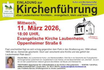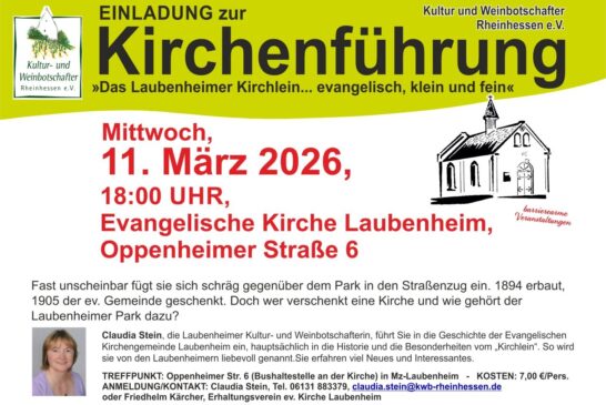 Die Kultur- und Weinbotschafterin Claudia Stein und der Ev. Kirchenerhaltungsverein laden herzlich ein zur „Kirchlein-Führung“ am Mittwoch, den 11. März, um 18:00 Uhr, Oppenheimer Straße 6 in Mainz-Laubenheim Kosten: 6,00 € pro Person inkl. 1 Glas Wein Ende April 2026 verwandelt die Grundschule Laubenheim den Laubenheimer Sportplatz in eine echte Zirkusmanege! Eine Woche lang trainieren die Kinder mit echten Zirkusprofis und zeigen am Ende der Woche ihr Können in großen Aufführungen ihren Eltern. Dabei probieren die Kinder Neues Guter Wille allein reicht leider nicht: Zur Finanzierung des Projekts sind wir auf Spenden angewiesen. Jede Spende zählt – gemeinsam machen wir die Zirkuswoche möglich! Empfänger : Förderverein Grundschule Mainz Laubenheim Euer Förderverein Bei Rückfragen oder Spendenquittung meldet euch gerne: spenden.zirkusprojekt@gslaubenheim.de
